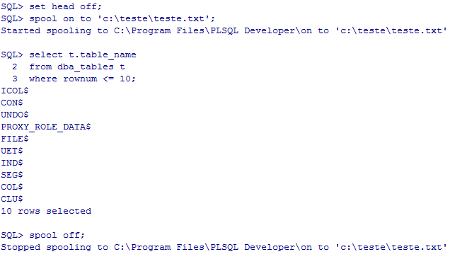 O primeiro comando SET HEAD OFF; é um parâmetro que faz com que o cabeçalho da colunas não seja exibido. E já chegamos ao nosso foco, em nosso caso a sintaxe do comando é a seguinte SPOOL ON TO ‘DIRETORIO’;.O próximo passo é explicitar a query que queremos exportar, no meu caso fiz uma query que retorna 10 nomes de tabelas existentes no banco de dados.