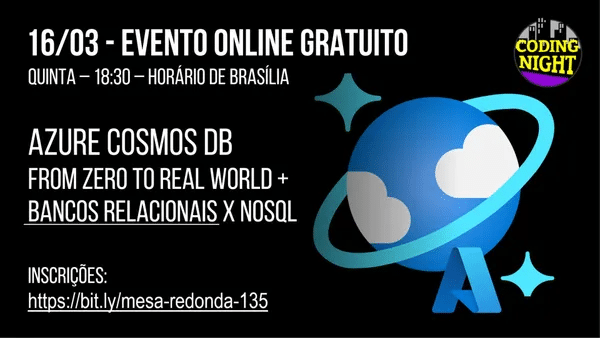 Este novo evento ONLINE e GRATUITO do canal Coding Night abordará primeiramente o Azure Cosmos DB: um banco de dados NoSQL totalmente gerenciado pela Microsoft e enfatizando como podemos utilizá-lo no dia a dia de maneira adequada.