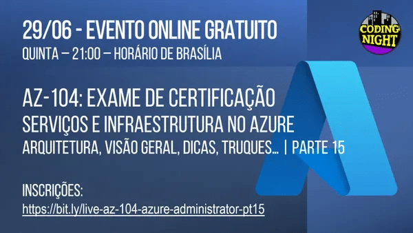 Acompanhe então nesse evento ONLINE e GRATUITO no canal Coding Night a 15a. parte desta série sobre o exame AZ-104: dicas sobre a prova, como realizar a mesma sem custos, orientações e como você poderá ir além nos seus conhecimentos sobre administração de uma infraestrutura na nuvem!