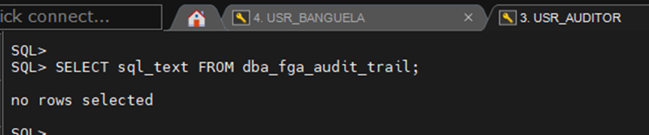SELECT SQL_TEXT FROM DBA_FGA_AUDIT_TRAIL;Pode dormir tranquilo, USR_BANGUELA. Apesar de ter obtido um retorno de 25 linhas, ele não violou os critérios impostos. No entanto, essa situação mudará com o próximo comando: